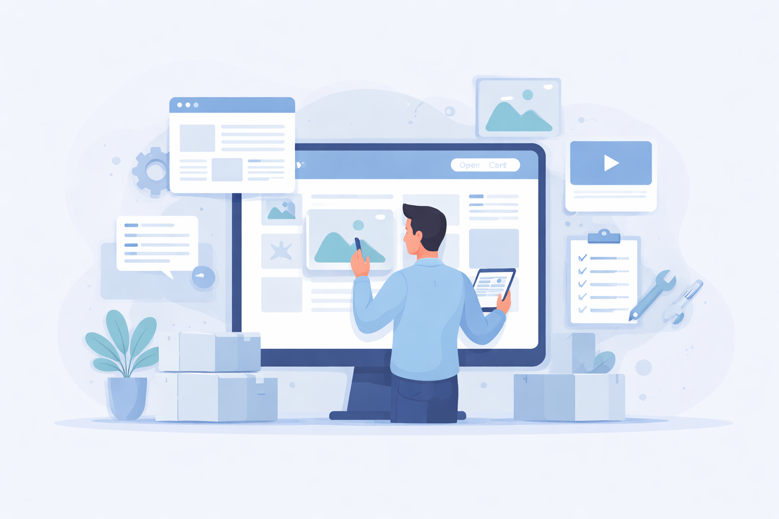 Контент-менеджер работает непосредственно в админке OpenCart, учитывая особенности платформы и структуру каталога.